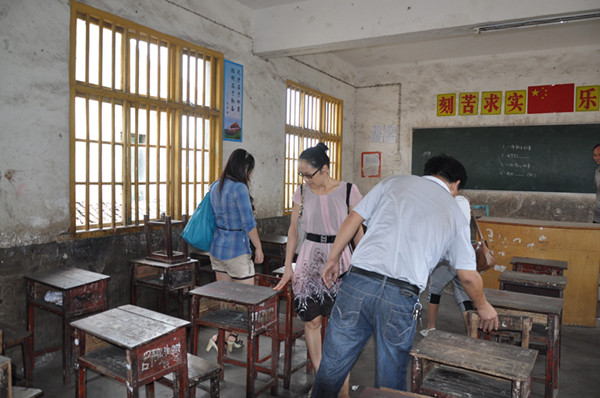 圖為邵瑛(中)、宇森汽貿負責人等在惠民學校察看學生課桌破損情況