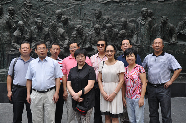 考察團成員在重慶市上清寺“風雨同舟共商國是”浮雕前合影留念