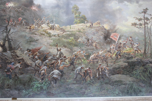 從停車坪橫穿公路,進入黃洋界游客服務中心。服務中心也是畫地為牢,依山而筑,約兩層樓高,但從外面看也就是一層大樓。大廳極其寬敞,正中心懸掛著一幅巨大油畫,畫面即是當年的黃洋界保衛戰。梭標大刀,土槍土炮,石頭圓木,都是武器,正所謂“枯木朽株齊努力”。
