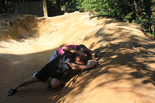 我借用一頂紅軍八角帽戴在頭上,與一位同仁進入工事,趴在溝壕中。一會兒叫“臥倒”,兩人作埋頭俯臥狀,仿佛敵軍炸彈在工事附近爆炸;一會兒喊“敵人上來了,快打”,兩人向沖上山來的敵人做開槍狀;一會兒做投擲手榴彈狀—用礦泉水瓶權當“手榴彈”;體驗了一番“當年鏖戰急”的景象,引得旁觀同仁哄然大笑,并不停地“咔嚓咔嚓”,為我們兩人留下了許多“戰爭”的身影。事后一看,嘿,照得很自然很逼真嘛!
