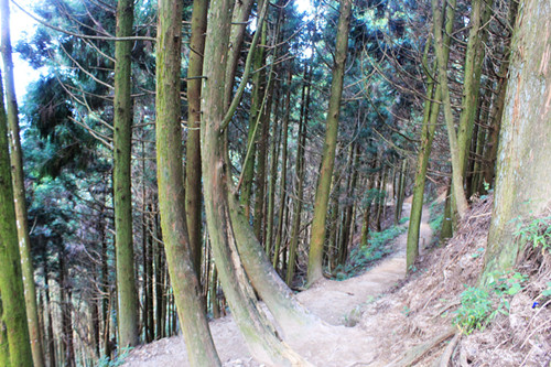 從鋼炮平臺西行數十步,有一條窄窄的小道,兩邊仍是杉樹筆立。這條小道蜿蜒曲折,通向山腳。小路旁立了一塊長方形的木牌,說明這里即是當年毛澤東、朱德等挑糧上山的小道。