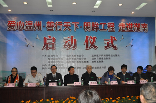 1126,“愛心溫州·善行天下·明眸工程·走進湖南”啟動儀式在湖南懷化市第三人民醫院舉行。全國人大常委、全國人大法律委員會副主任、民盟中央副主席李重庵出席并講話。民盟湖南省委專職副主委湯濁主持。民盟中央委員、溫州醫學院附屬眼視光醫院院長王勤美,中共懷化市委常委、組織部長、統戰部長王昌義,懷化市副市長汪輝,懷化市政協副主席、民盟懷化市委主委武思元,婁底市政協副主席、民盟婁底市委主委邵瑛,溫州慈善總會副會長廖秀樞,民盟省委秘書長趙為濟,社會服務處處長姚振軍,婁底市政協常委、民盟婁底市委醫衛工作委員會副主任、婁底市眼科醫院院長廖華等出席啟動儀式。