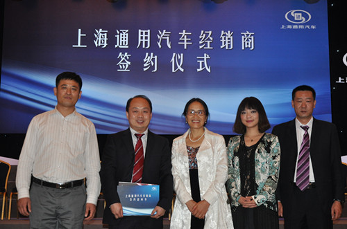 上海通用汽車公司總經理王曉秋(左5)、副總經理(蔡斌右1),與此次簽約的全國10家凱迪拉克經銷商代表潘杰(右5)等合影。 邵瑛攝影