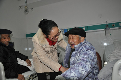 邵瑛(中)到醫院看望老盟員梁兆龍(右)