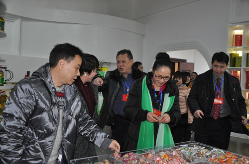 邵瑛(中)等在產品展示廳品嘗鴻冠集團生產的餅干