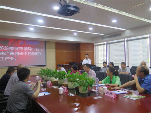 根據婁底市政協2015年民主協商工作安排,將婁底市金屬板材深加工產業發展內容,作為民盟婁底市委、九三學社婁底市委聯合開展的界別協商課題,并組成了由婁底市政協副主席劉繼清、邵瑛任組長,市政協提案委、民盟婁底市委、九三學社婁底市委、市政府辦、市經信委、相關縣市區、婁底經開區、漣鋼規劃部等單位和部門相關負責人和專家組成的調研組,在婁底市經信委的大力支持與配合下,調研組7月份中下旬先后到雙峰縣、漣鋼、婁底市經開區等地調研,了解婁底市域內金屬板材特別是不銹鋼深加工產業發展情況;此次專程赴廣東省佛山等地,重點調研不銹鋼產業發展情況。調研組先后馬不停蹄地實地參觀考察了宏旺投資集團有限公司、廣東美凌集團、廣東菱王電梯有限公司、不銹鋼大市場、金鑫祥不銹鋼制品有限公司、燁輝鋼鐵貿易有限公司、金大田門業有限公司、佛山市鑫奇電器集團、英皇電器有限公司,并與以上企業負責人座談。