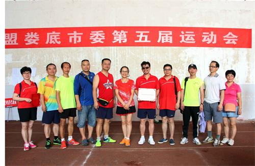 2018年 7月14日,民盟婁底市委第五屆運動會在湖南人文科技學院體育館圓滿落幕。婁底市政協副主席、民盟婁底市委主委邵瑛,湖南人文科技學院校長劉和云、黨委副書記劉鐵銘,中共婁底市委統戰部常務副部長王美成,盟市委副主委羊小慶、朱宏志,婁底市第一人民醫院黨委書記左建輝,婁底市第四中學校長李永福出席開幕式并參賽。盟市委副主委肖建泳主持開幕式和閉幕式。