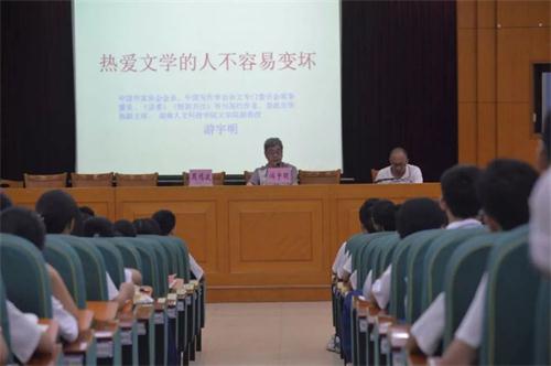 游宇明在報(bào)告中說(shuō):我們平時(shí)“走路”太快,靈魂有時(shí)來(lái)不及跟上,需要在文學(xué)、在散文中找到信仰,我們的人生與文學(xué)是息息相關(guān)的。游宇明指出,首先我們?nèi)松枰膶W(xué)。因?yàn)槲膶W(xué)可以培養(yǎng)一個(gè)人的人文精神,幫助一個(gè)人形象地認(rèn)識(shí)社會(huì),是一種情感溝通管道,又是一種優(yōu)雅的娛樂(lè)方式。同時(shí)游宇明指出:文學(xué)也需要人生。文學(xué)需要興趣,需要人的某些內(nèi)在素養(yǎng)。游宇明說(shuō),文學(xué)創(chuàng)作的資源無(wú)非三種,一是經(jīng)驗(yàn)資源,一是學(xué)養(yǎng)資源,一是思想資源。所謂“經(jīng)驗(yàn)資源”,就是我們對(duì)日常生活、工作、學(xué)習(xí)等等的感受。如果我們把文學(xué)創(chuàng)作比作一次鳥(niǎo)兒的飛翔,生活就是鳥(niǎo)兒最初落腳的樹(shù)枝。游宇明以自己的求學(xué)經(jīng)歷及個(gè)人幾部作品為例,詳細(xì)說(shuō)明人生對(duì)文學(xué)的作用。在作演講的同時(shí)不時(shí)吟詠詩(shī)詞,全場(chǎng)自發(fā)響起一陣陣熱烈的掌聲。在講座中,游宇明還介紹了湖南人文科技學(xué)院文學(xué)院的辦學(xué)情況和培養(yǎng)的部分杰出人才,鼓勵(lì)佛山學(xué)子積極報(bào)考該院。全場(chǎng)氣氛活躍,座無(wú)虛席,提問(wèn)環(huán)節(jié),同學(xué)們爭(zhēng)先恐后,自始至終無(wú)人退場(chǎng)。周鴻波老師在最后的總結(jié)中說(shuō):“游宇明教授以淵博的學(xué)識(shí)、對(duì)文學(xué)的熱情贏得在場(chǎng)師生的一致好評(píng)。游宇明教授是一位有文學(xué)情懷、文學(xué)底蘊(yùn)和文學(xué)才華的人,值得在場(chǎng)的每位同學(xué)學(xué)習(xí)?!弊詈螅瑢W(xué)術(shù)報(bào)告在雷鳴般的掌聲中結(jié)束。