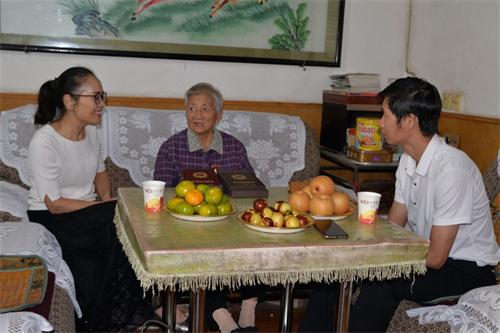 邵瑛(左)慰問老盟員梁心仁(中)