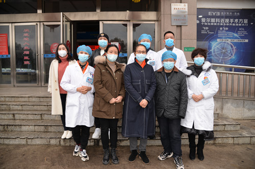 邵瑛(中)到盟員廖華(左3)創辦的愛爾婁底眼科醫院了解復工及參與抗疫工作情況