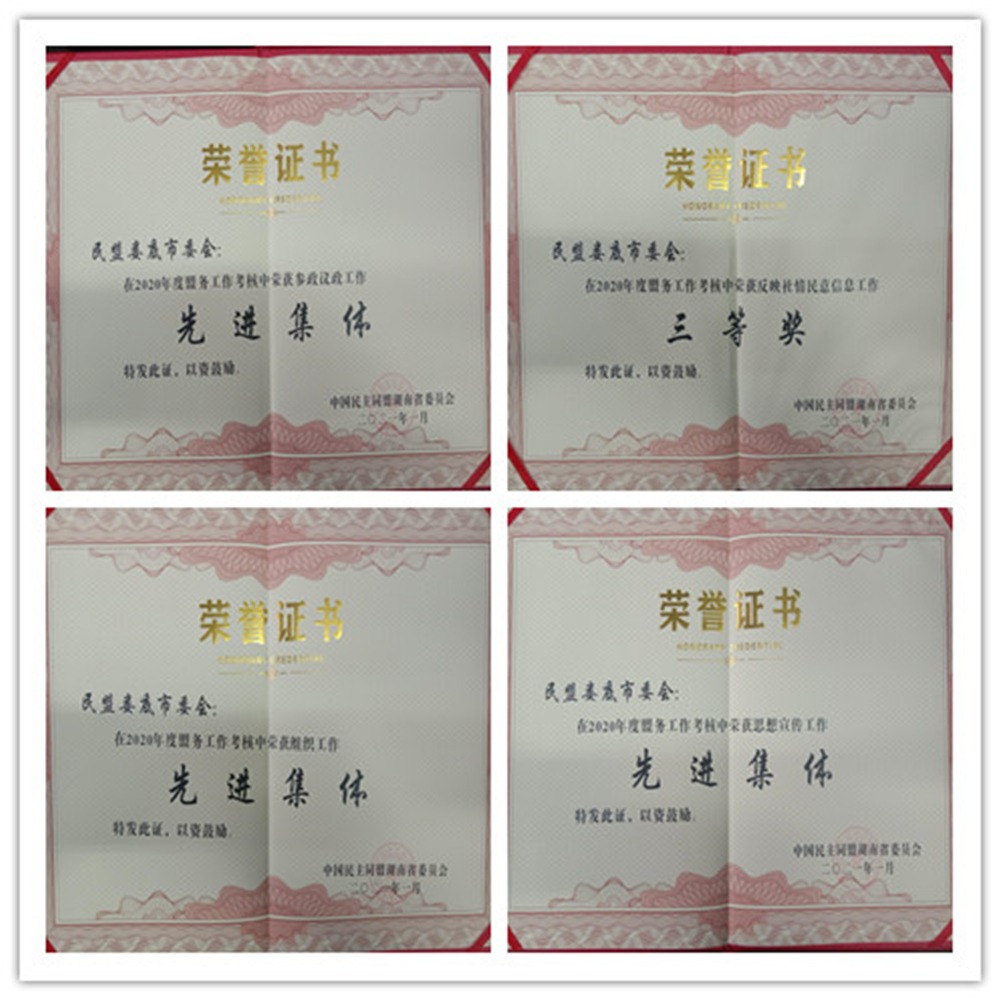 會議總結(jié)了2020全省盟務(wù)工作,對2021年盟務(wù)工作進行了部署,表彰了2020年度盟務(wù)工作專項考核中表現(xiàn)突出的先進集體和先進個人。民盟婁底市委會榮獲5項先進集體表彰,分別為“民盟湖南省委會2020年度盟務(wù)工作考核先進集體(綜合獎)”“民盟湖南省委會2020年參政議政工作先進集體”“民盟湖南省委會2020年度反映社情民意信息工作先進集體三等獎”“民盟湖南省委會2020年度組織工作先進集體”“民盟湖南省委會2020年度思想宣傳工作先進集體”劉兆梅榮獲“民盟湖南省委會2020年度反映社情民意信息工作先進個人”,王姣妮榮獲“民盟湖南省委會2020年度思想宣傳工作先進個人”,王紅貴榮獲“民盟湖南省委會2020年度統(tǒng)戰(zhàn)理論研究優(yōu)秀個人”,李紅輝榮獲“民盟湖南省委會2020年度榮獲社會服務(wù)工作先進個人”。
