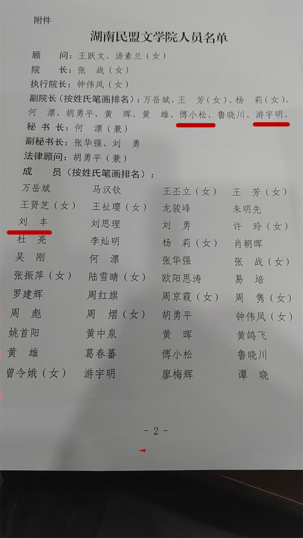 12月10日,湖南民盟文學院成立大會在長沙召開。婁底市政協副主席、民盟婁底市委會主委傅小松,湖南人文科技學院教授、一級作家游宇明被聘為湖南民盟文學院副院長,盟員劉豐為湖南民盟文學院成員。
