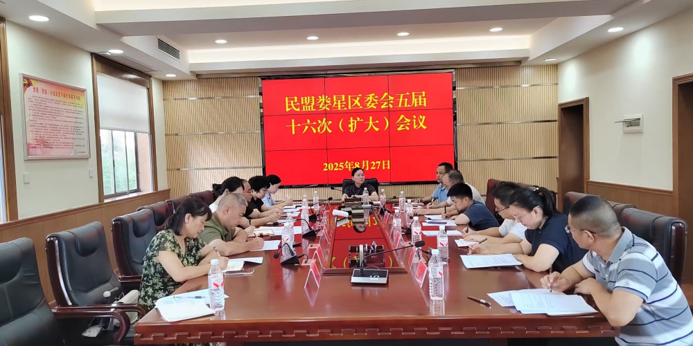 2025年8月27日下午,民盟婁星區委會在區統戰系統會議室召開民盟區委五屆十六次(擴大)會議,會議由區政協副主席、盟區委會主委王文成主持,區委統戰部常務副部長譚新吾、區委統戰部黨派政工組組長劉思純等應邀出席,盟區委會副主委文細光、龔偉敏、吳湘枝、程杰,全體委員及支部主委參加會議。