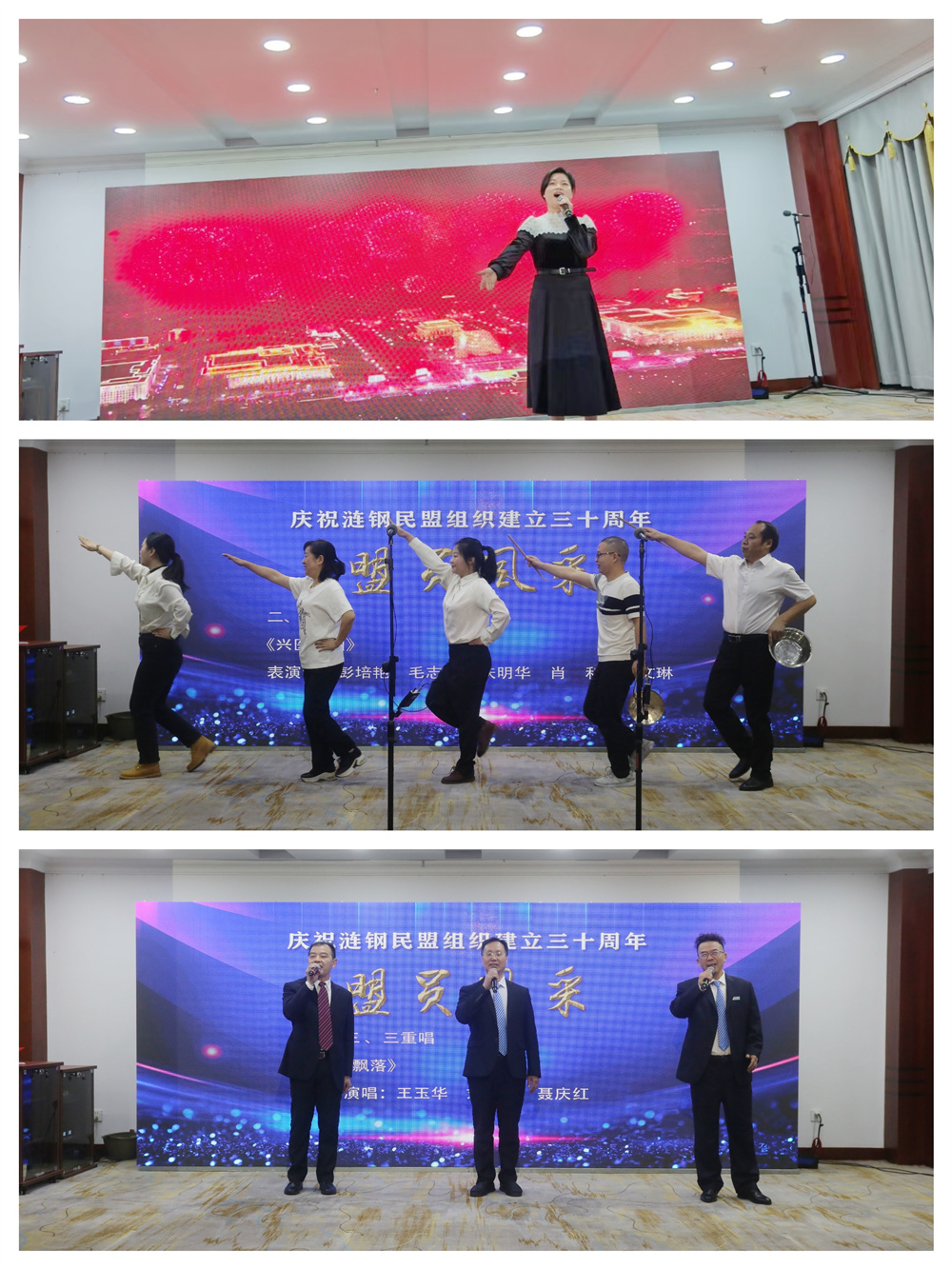 隨后,來自民盟漣鋼支部、漣鋼中學支部、婁底市第一人民醫院支部的盟員們自導自演了一臺精彩的文藝演出,先后表演了《幸福中國一起走》(女聲獨唱)、《興醫強國》(三句半)、《飄落》(男聲合唱)、《最后一次演講》(情景表演)、《深山問苦》(京劇清唱)、《民盟之歌》(集體朗誦)等文藝節目,表達愛國愛黨愛盟之心。
