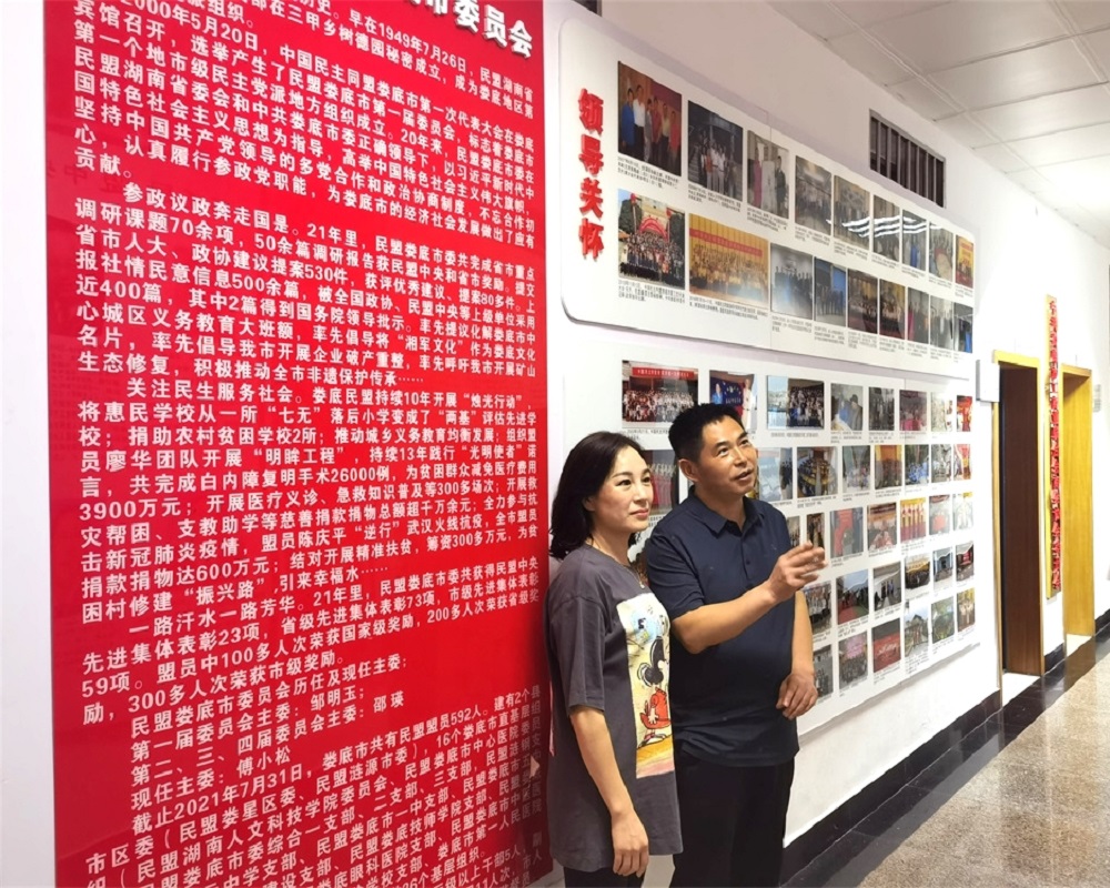 傅小松(右)向高鴿子(左)介紹婁底民盟宣傳欄