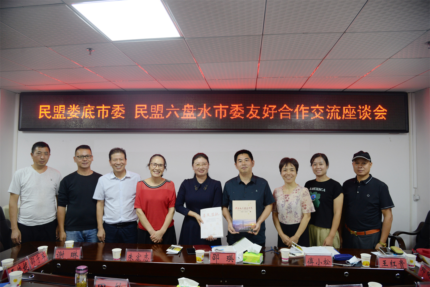傅小松(右4)代表民盟婁底市委向民盟六盤水市委贈送《共畫最美同心圓》《參政議政文集》